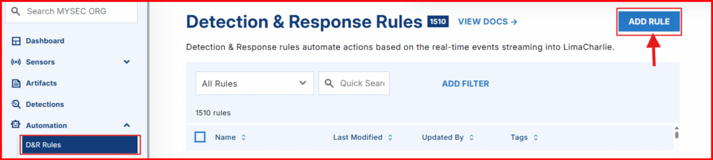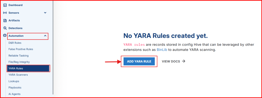1. Head to LimaCharlie Dashboard and to Automation > YARA Rules > ADD YARA RULE