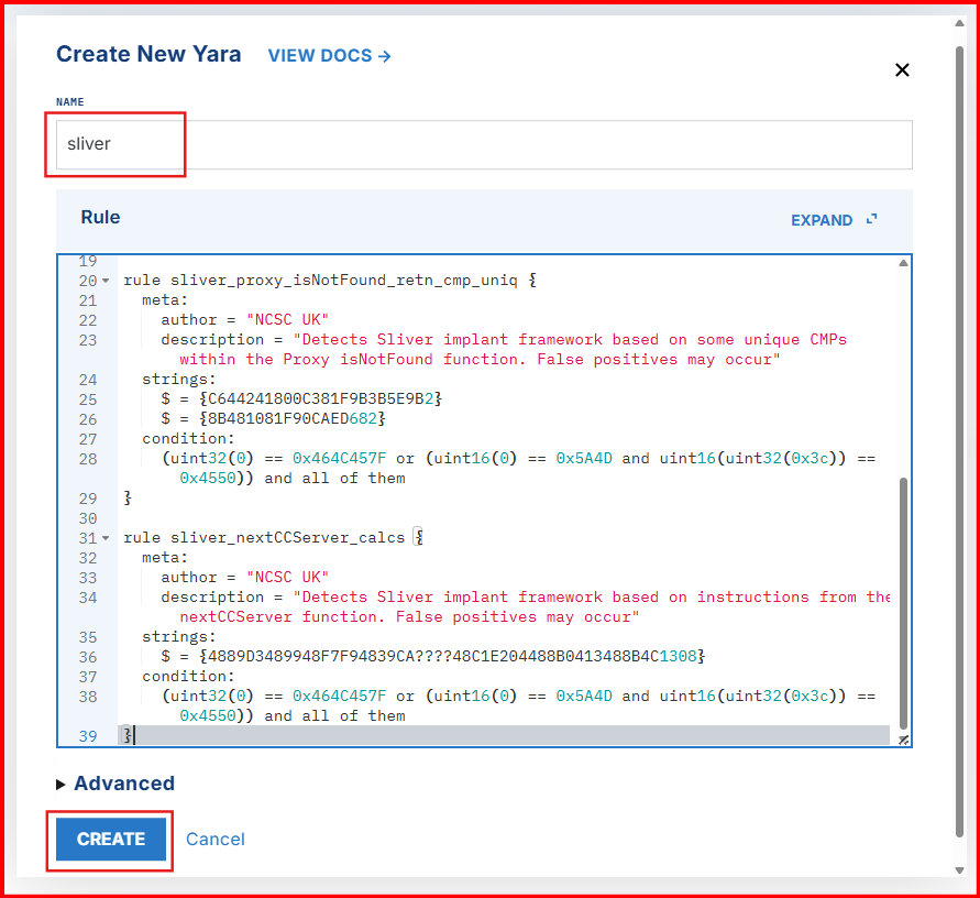 Since we’re working with the Sliver C2 framework, we can make our detection more precise by using a YARA signature specifically designed to identify Sliver activity. Fortunately, the UK’s National Cyber Security Centre (NCSC) has shared some excellent threat intelligence on Sliver—including detailed YARA rules and other detection techniques.