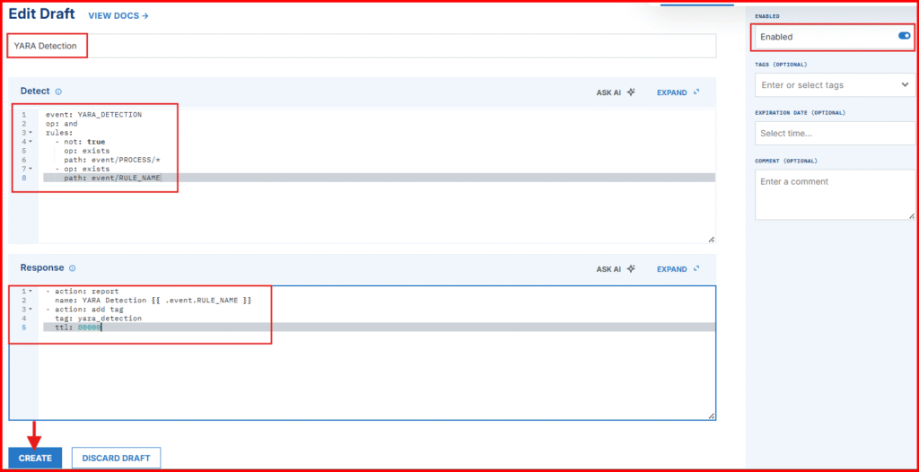 - Give your rule a name: YARA Detection