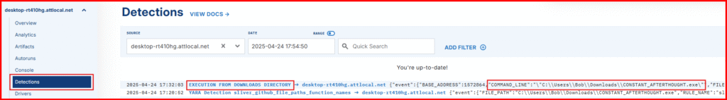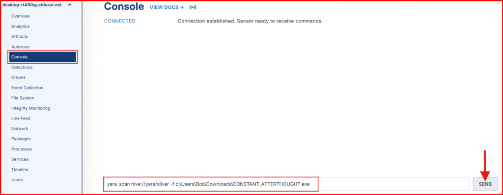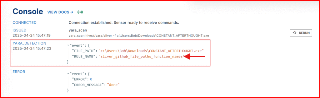 Since we already know there’s a Sliver implant in the Downloads folder on our Windows VM, we can run a manual YARA scan with the EDR sensor to test if our setup is working correctly. This quick check will confirm that our YARA signature is functioning as expected and that everything is properly configured so far.