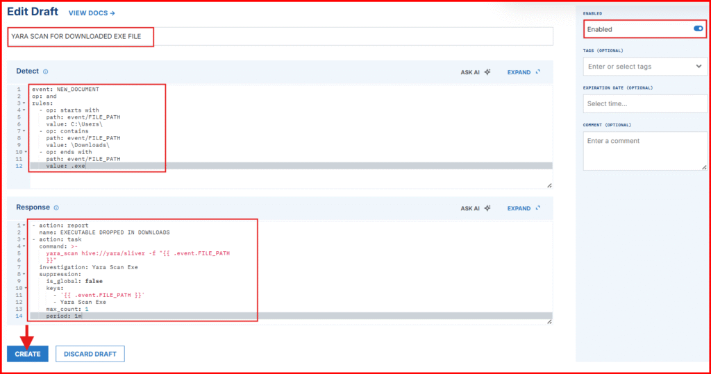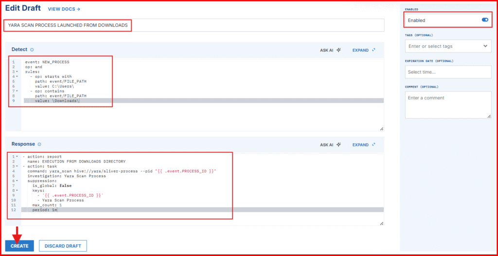 Now let’s configure LimaCharlie to respond when a YARA match is detected. We’ll do this by creating D&R (Detection & Response) rules that automatically generate alerts whenever a YARA rule is triggered.
