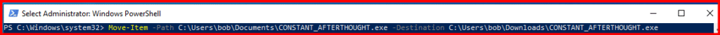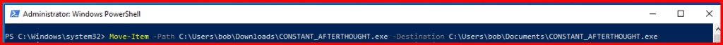 Move-Item -Path C:\Users\Bob\Downloads\[payload_name].exe -Destination C:\Users\Bob\Documents\[payload_name].exe