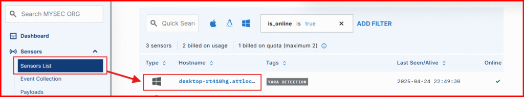 1. Open Sensors List in LimaCharlie and select your Windows VM